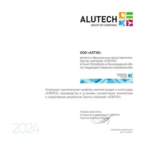 Компания «АЛТЭК» является официальным представителем ГК «АЛЮТЕХ» на территории Северо-Западного региона. Мы предоставляем своим клиентам полный комплекс услуг по поставке, монтажу, гарантийному и сервисному обслуживанию продукции, производимой ГК «АЛЮТЕХ», на высоком уровне и в кратчайшие сроки. Также доступен полный ассортимент алюминиевых окон и дверей, сдвижных порталов, фасадное остекление, противопожарные конструкции и эксклюзивные алюмо-деревянные окна. Готовые решения из каталога или изготовление проекта по индивидуальным параметрам – наши специалисты помогут выбрать тип въездной системы в зависимости от условий и особенностей эксплуатации, а также ожиданий клиента. Специалисты нашей компании постоянно совершенствуют свои знания, проходят обучение и повышение квалификации на заводах ГК «АЛЮТЕХ», чтобы иметь возможность грамотно осуществлять консультации и профессионально выполнять подбор оборудования для ваших объектов. Для удобства наших клиентов мы открыли четыре полноценных шоу-рума в разных концах Санкт-Петербурга, в которых разместили полноразмерные образцы всей продукции ALUTECH.
