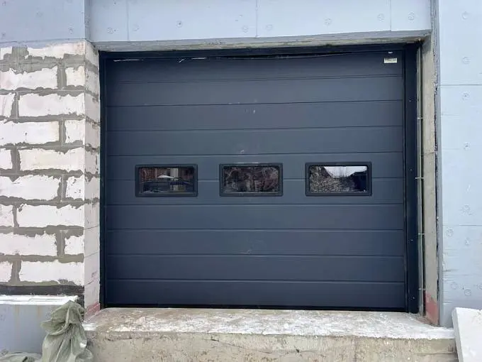 S-гофр цвета RAL9006 (серебристый металлик), с автоматическим управлением, торсионные пружины, с панорамным остеклением, с калиткой
